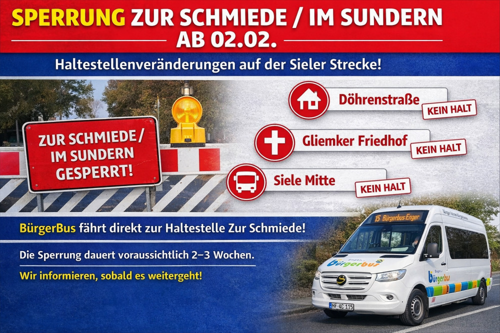 02.02.2026. Während der Sperrung fährt der Bürgerbus auf der Strecke über Siele, direkt über die Meller Straße zur Haltestelle Zur Schmiede.