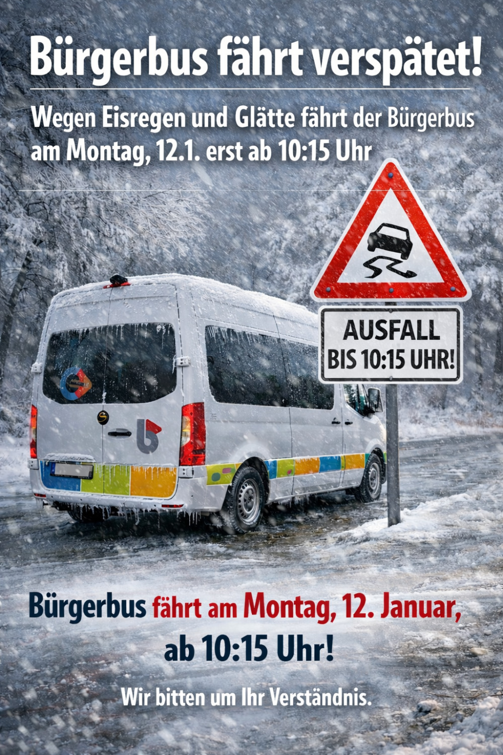 Wir behalten die Wetter- und Straßenlage weiterhin genau im Blick und informieren euch, falls sich etwas ändert.